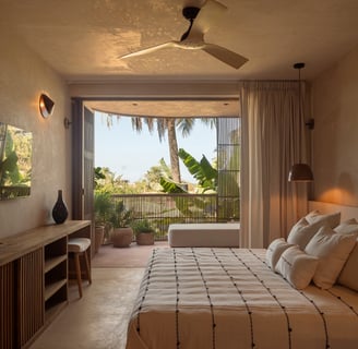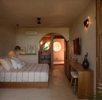 Each room is a sanctuary, where the boundaries between indoor and outdoor living merge seamlessly. The natural materials and carefully curated textures create a calming ambiance that encourages guests to slow down and embrace the present moment. Every detail, from the earthy tones of the walls to the intricate palm bone details, speaks to a deep appreciation of the local environment and culture.