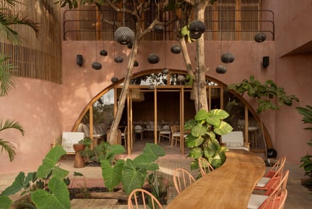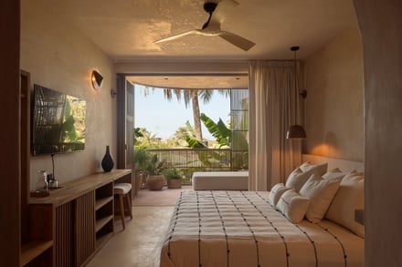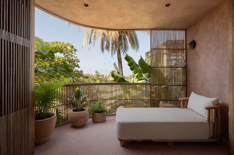 The use of local materials further highlights the hotel’s dedication to cultural preservation. Walls finished in earthy pink-toned chukum bring warmth and character, while doors and enclosures crafted from palm bone add a unique textural element. Macuil wood, a native hardwood known for its durability and beauty, is featured throughout the hotel, reflecting a deep respect for traditional craftsmanship.