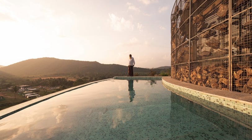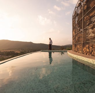 The infinity pool, positioned at the edge of the site, enhances the experience of being immersed in the landscape. Swimming here feels like floating above the valley, with the mountains stretching endlessly in the distance.