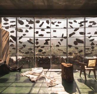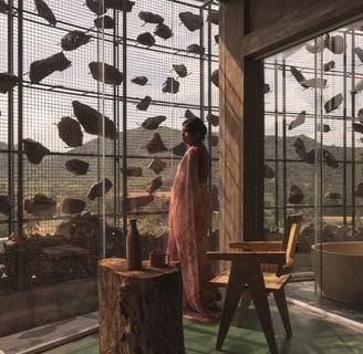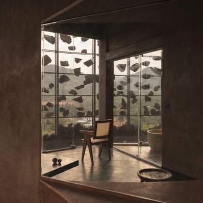 Rising organically from the ground, blending seamlessly with its surroundings, poured-earth walls, crafted using soil from the site, reinforce this connection while reducing the environmental impact of construction. The gabion walls, built from site-sourced rocks, further emphasize this philosophy, ensuring every element feels like an extension of the terrain.
