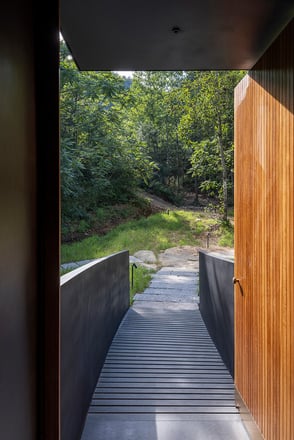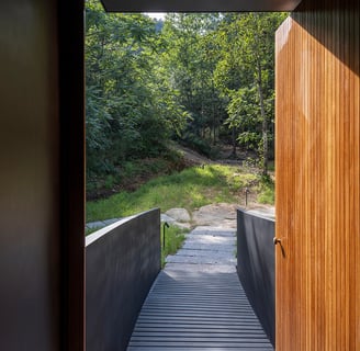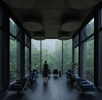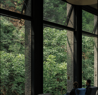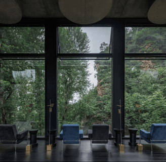 The second-floor lounge, enclosed by floor-to-ceiling glass, sits among the treetops. Here, guests can pause and reflect, with operable windows that bring in the scent of the forest and the sound of the stream below. The design encourages intentional living—slowing down, breathing deeply, and embracing the beauty of each moment.