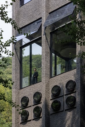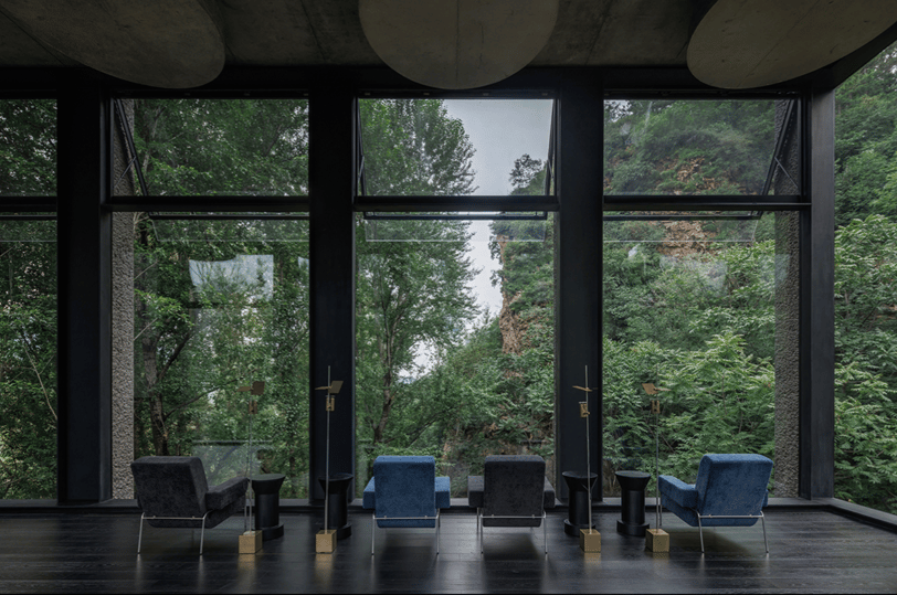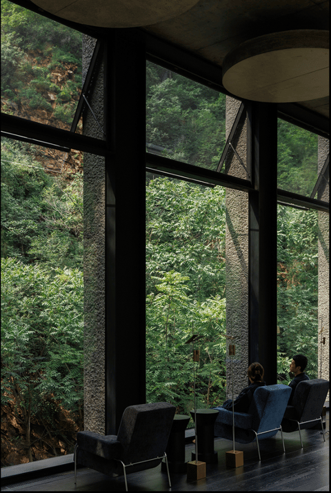 The exterior of the building is constructed from bush-hammered concrete, a textured material that mirrors the rugged cliffs of the Wulingshan valley. A dark-toned transparent coating adds a natural, subdued finish, allowing the structure to blend effortlessly into its surroundings.