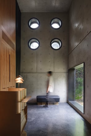 Strip windows along the western facade frame picturesque views of the valley, enhancing the sense of being part of the landscape. The thoughtful design choices throughout the retreat make every experience here feel intentional and deeply connected to the natural world.