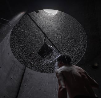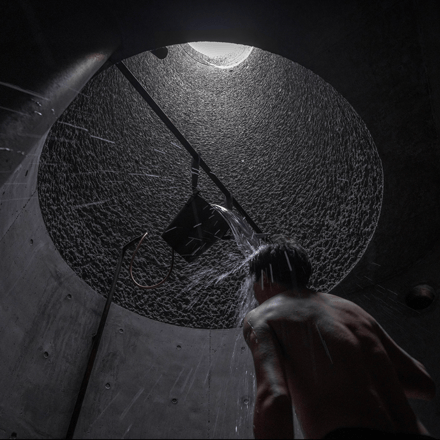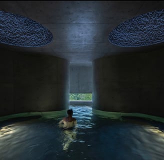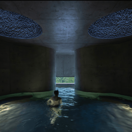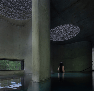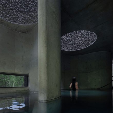 The heart of Eyestone Spring lies in its bathing spaces. On the third floor, a series of bath pools offer varying temperatures and treatments, each illuminated by eight-meter-high skylit wells. These light wells filter sunlight through the textured concrete walls, creating a serene, almost ethereal atmosphere.