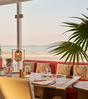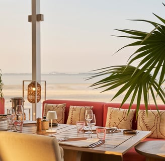 As the mood lightens and the sea draws near, dining shifts outdoors. Here, tables sit beneath woven canopies or along soft stone paths that edge the sand. The palette softens again, with linen white, driftwood, the pale blue of sky reflected in water.