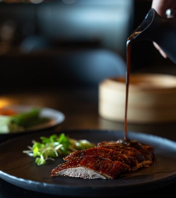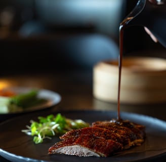 The atmosphere is warm and luxurious, yet remains grounded, layered with subtle references to Chinese craftsmanship and form. An open kitchen anchors the room, offering glimpses of handmade dumplings, Peking duck, and delicate meal preparation in motion. There’s theatre here, but it never feels loud.