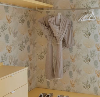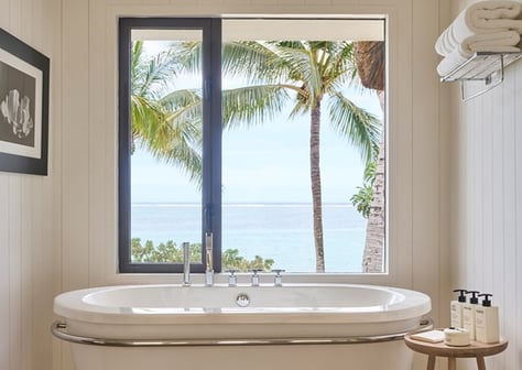 In the oceanfront suites, soft corals and sea greens mirror the surrounding landscape, creating an atmosphere that feels both intentional and effortless. Textures play a supporting role with woven rugs, curved timber joinery, and hand-plastered walls soften the space and give the eye somewhere to rest.